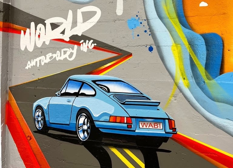 Commissioned to create six large-scale murals for World Auto Body Inc., transforming the facility with color, character, and bold visual energy. Each piece defined its department while unifying the space, turning an industrial setting into a vibrant, creative environment.