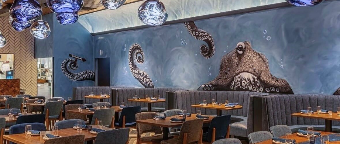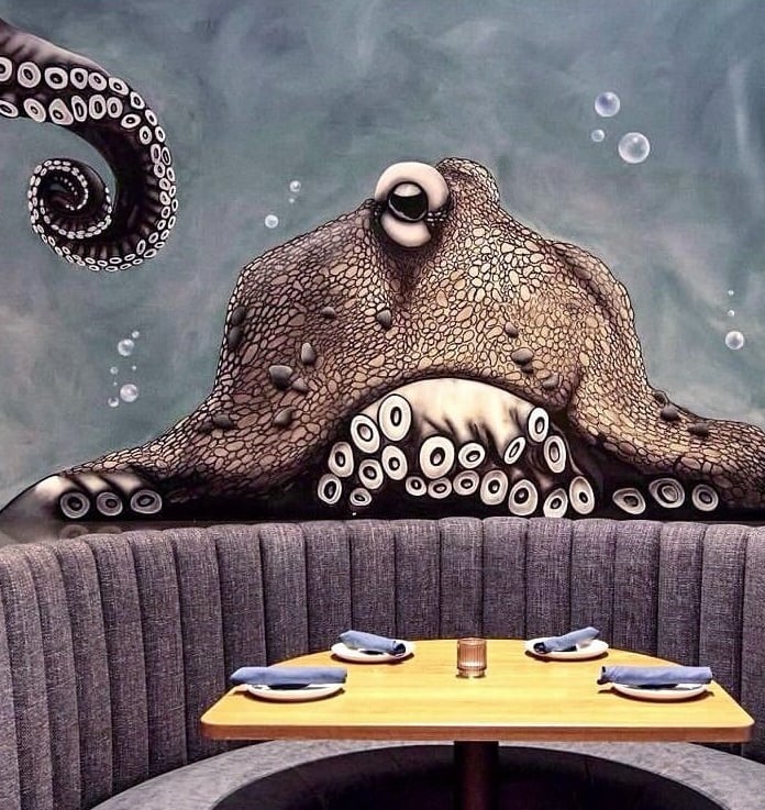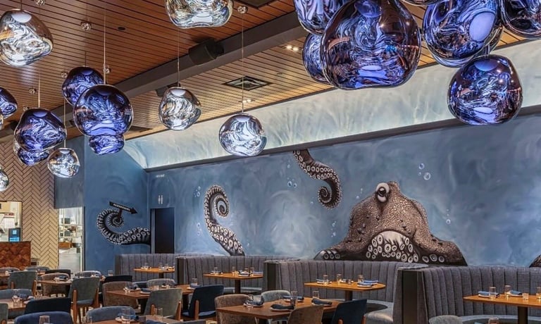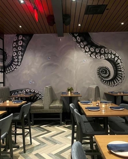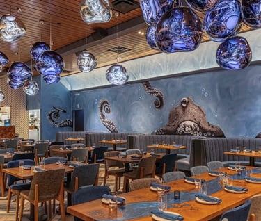 Dryft in Wellesley, Massachusetts, showcases a custom mural by Wild4Design, created in collaboration with TRIA to reflect the restaurant’s elevated coastal identity. The design features an intricate octopus centerpiece enhanced by layered lighting that evokes the movement and depth of water. Serving as a focal point within the dining space, the installation elevates the ambiance while strengthening the brand’s visual narrative. The project has been recognized by The Boston Globe, The Swellesley Report, and the New England Real Estate Journal for its creativity and craftsmanship.