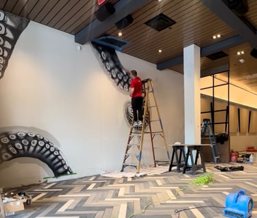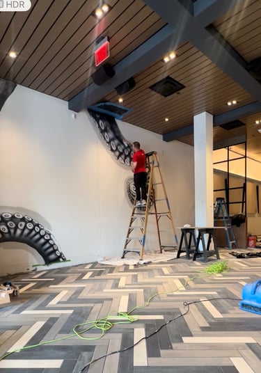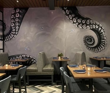 We partnered with Dryft and TRIA to create a statement mural that captures the restaurant’s coastal identity. Featuring an octopus centerpiece, the use of two-tone paint and accent lighting gives the effect of depth and movement, reflecting Dryft’s seafood-focused concept and atmosphere recognized by The Boston Globe, The Swellesley Report, and NEREJ.